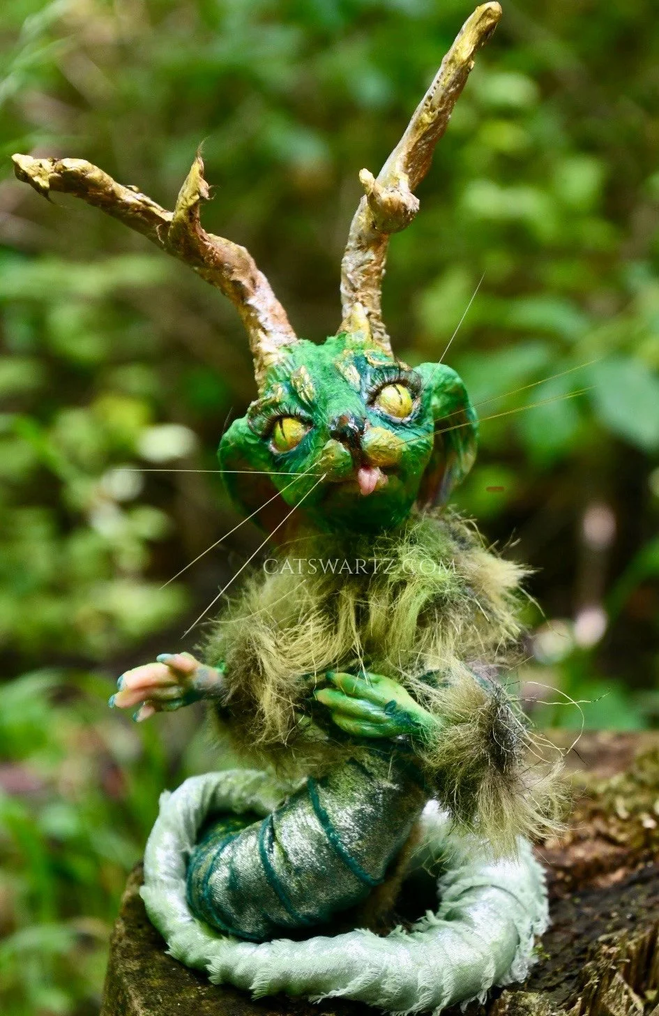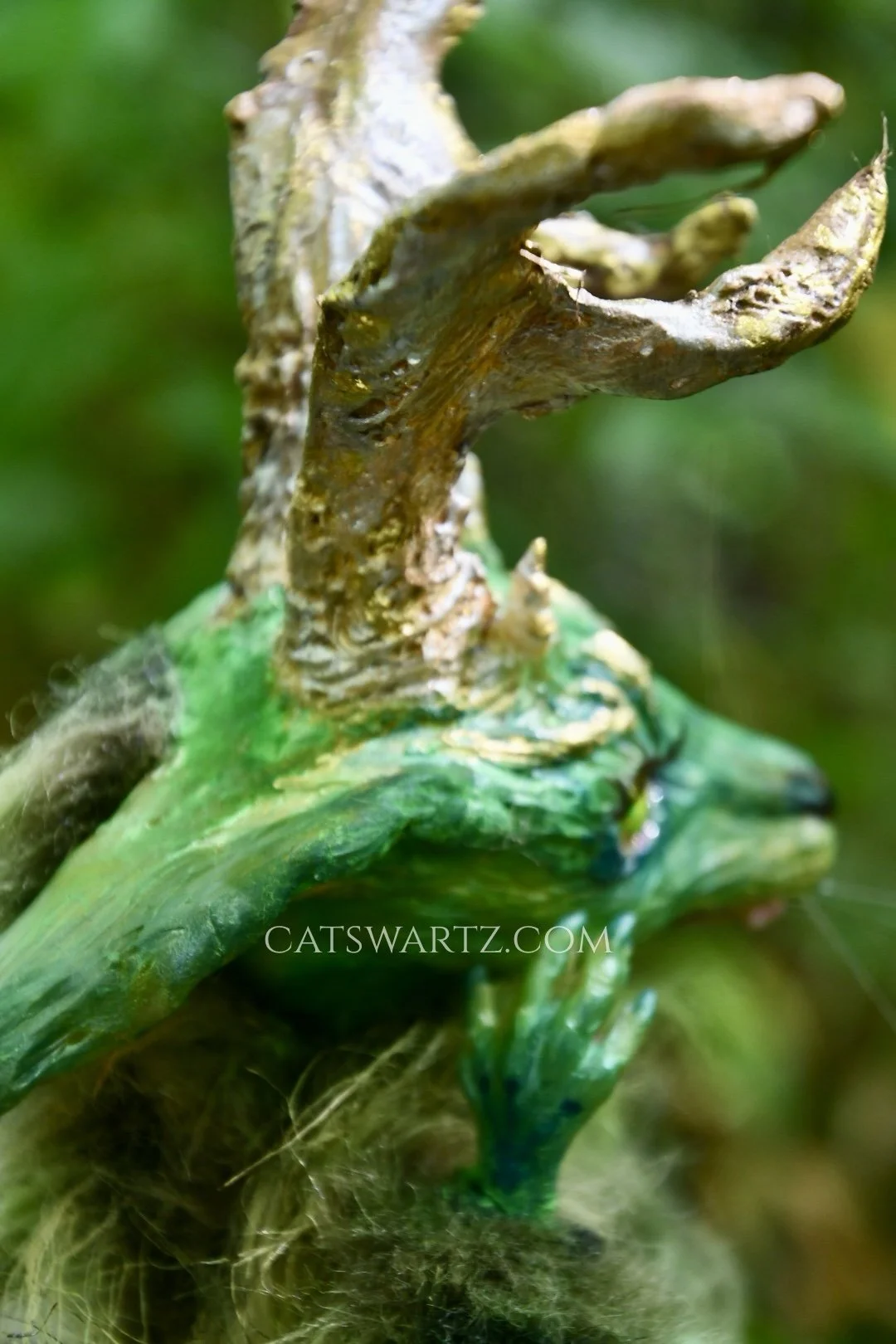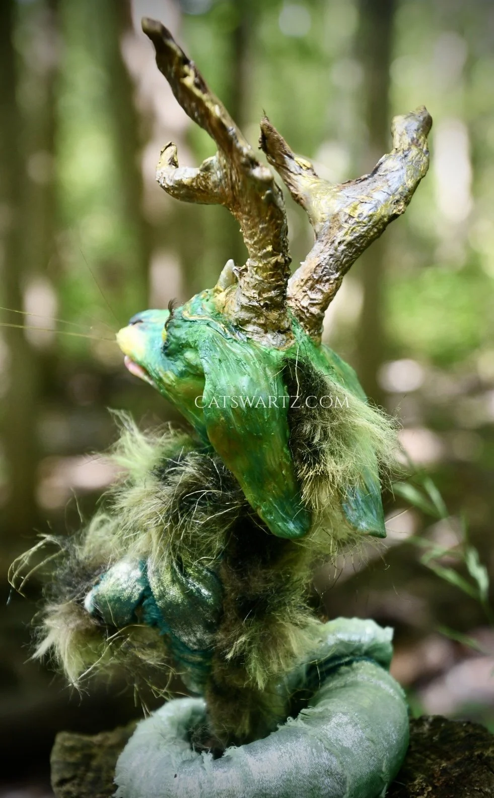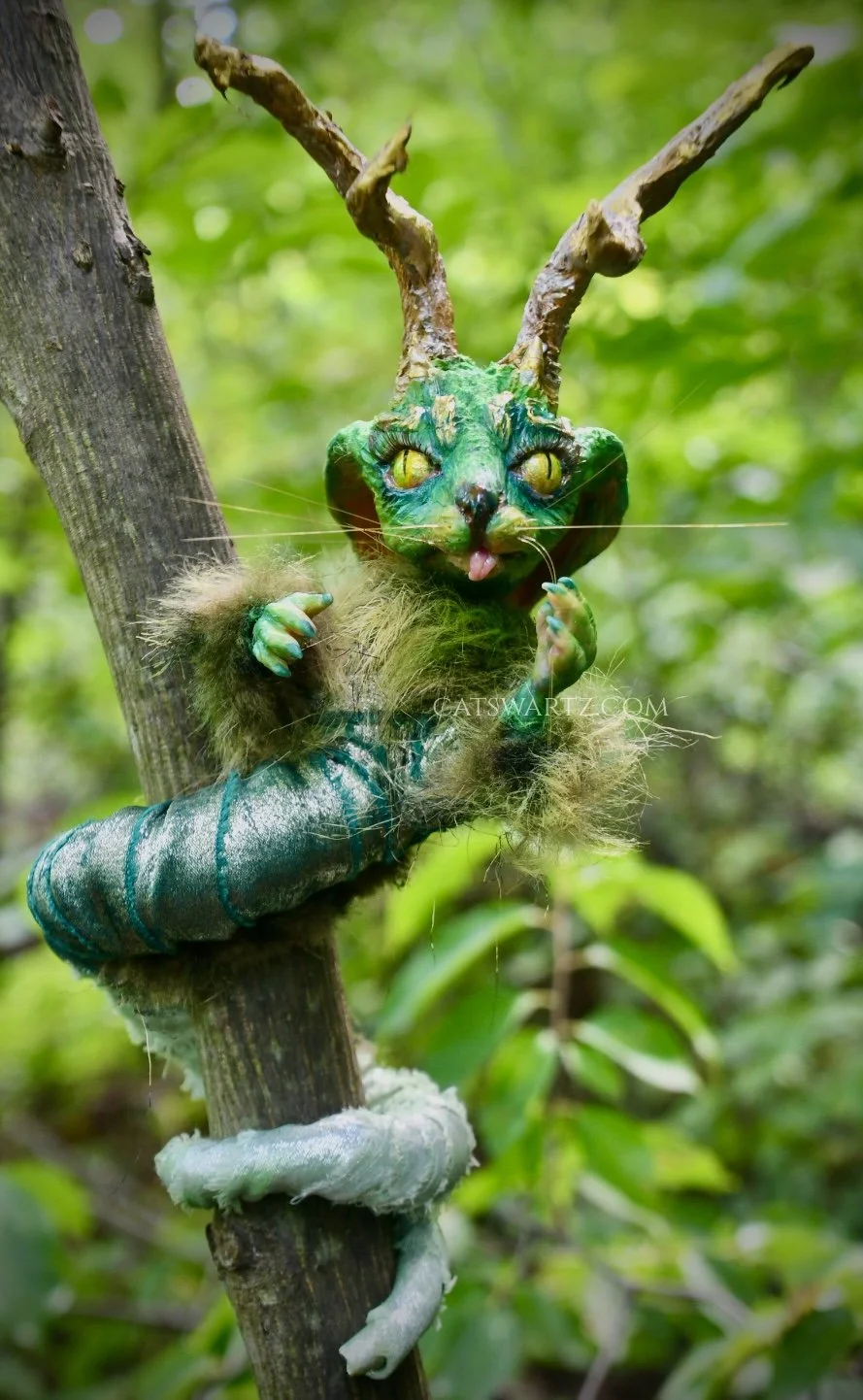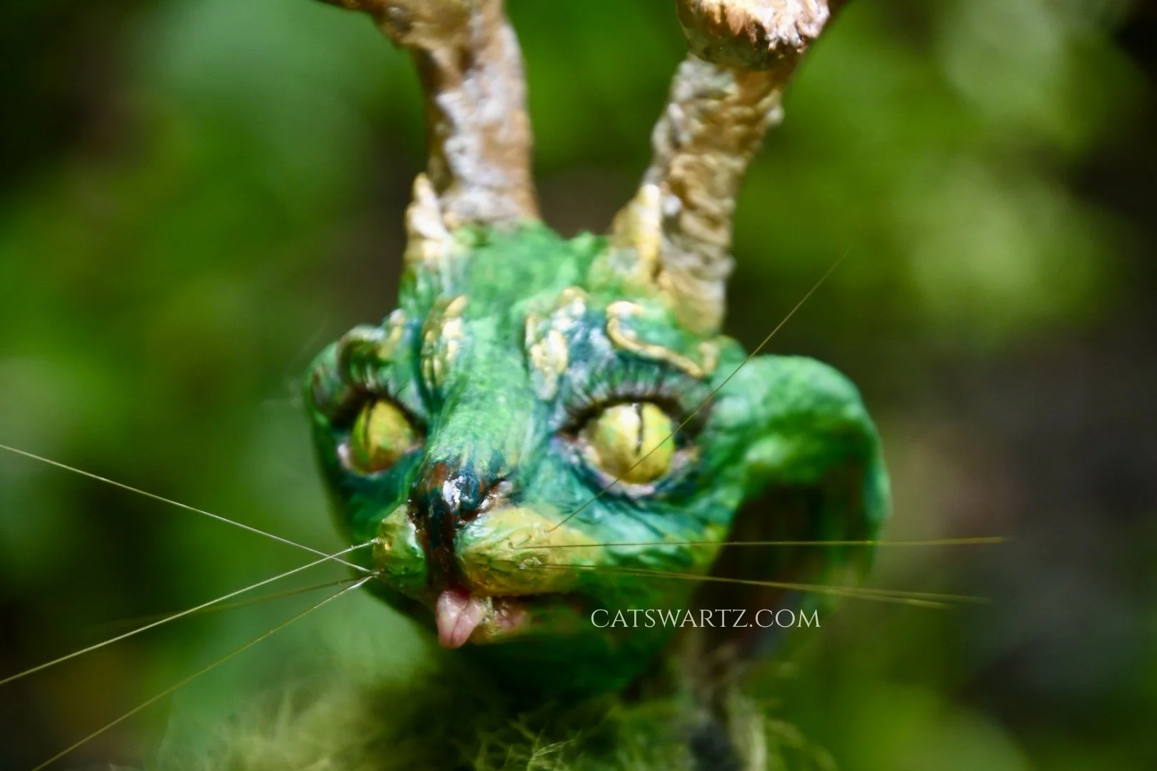 Aranya the Forest Pup Dragon, 2025. Polymer, paper clay, cold porcelain, mulberry paper, airbrush, acrylics, felt flocking, nylon whiskers & lashes, upcycled materials, poseable body & limbs, varnish, 23” x 5” x 4.5”