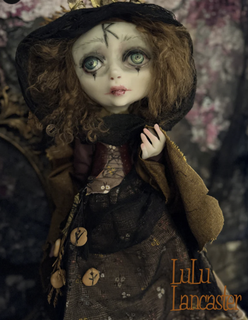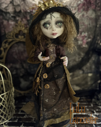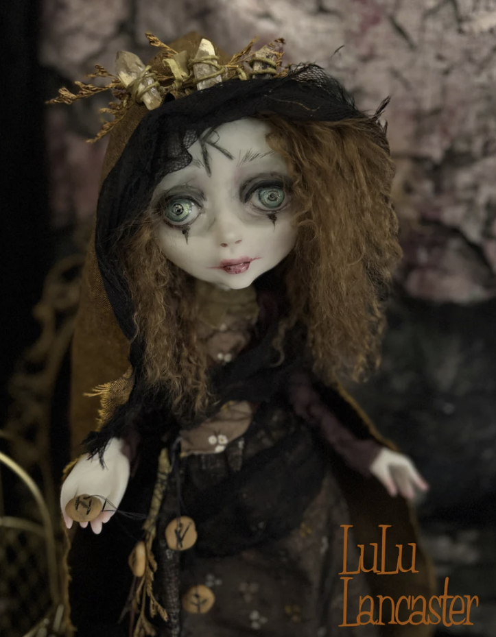 Rhylla the Rune Witch, 2025, 16" height and has wired limbs she can hold a pose. She wears tattered fabrics with cotton gauze trims and tiny vintage brass buttons. A leather waist cincher and dried florals. Her hood features wire wrapped smoky quartz points and dried florals. She has tiny Runes that dangle from one side. Her shoes are hand sculpted with a tiny heel and covered in matching fabrics. She travels with the wood doll stand and is removable from it.